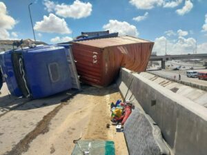 انقلاب واشتعال سيارة نقل ثقيل أعلى كوبري استاد برج العرب بالإسكندرية