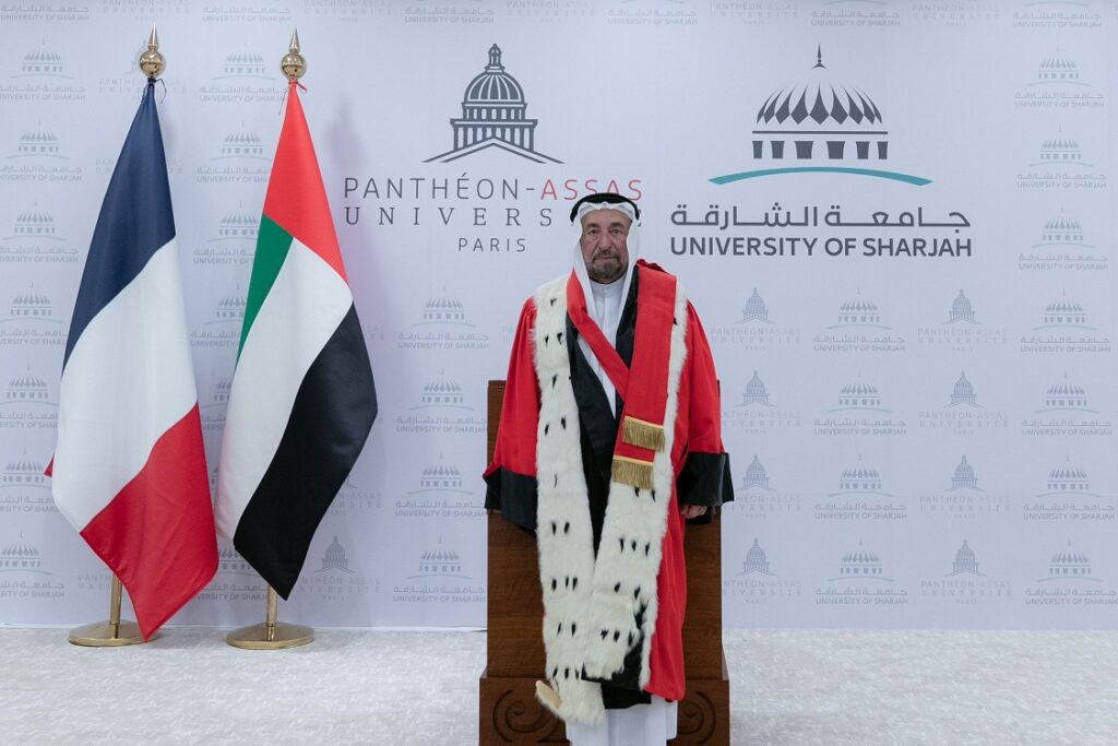 تسلّم الشيخ الدكتور سلطان بن محمد القاسمي، عضو المجلس الأعلى، حاكم الشارقة، الزمالة الفخرية العالمية من جامعة باريس بانثيون – أساس.