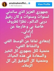 ونشرت آمال ماهر على صفحتها الرسمية بموقع تبادل الصور والفيديوهات “إنستجرام”، كما نشرت على صفحتها الرسمية بموقع تويتر تدوينة قالت فيها: “جمهورى العزيز الذى ساندنى لسنوات وسنوات وكان رفيق دربى الدائم، نظرًا لظروف خاصة بى وخارجة عن إرادتى.. أُعلن ابتعادى تمامًا عن الوسط الفنى والنشاط الفنى، متمنية لكل جمهورى كل الخير والسعادة فى هذه الحياة، ومتمنية كل التوفيق إلى كل الزملاء”.
