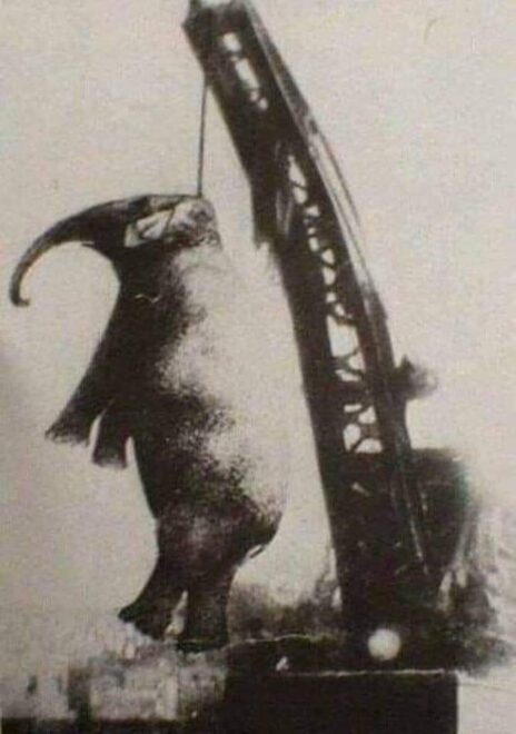 اقتادوا الفيلة إلى ميدان عام يكتبون فيها نهايتها، وأمام آلاف من الجماهير أيضًا وقفت «ماري» للمرة الأخيرة، وبجوار أحد محطات السكك الحديدية تجمع الآلاف صغارًا وكبارًا لرؤية اللحظات الأخيرة في حياة «الفيلة القاتلة». عند نقطة ما وقفت «ماري» تنظر إلى الجميع، بينما تم ربطها بحبل وتعليقها في رافعة تستخدم في السكك الحديدية، وبعد رفعها سقطت وانقطع الحبل بسبب وزنها الثقيل، إذ كانت يدعونها في السيرك «ماري الضخمة»، أدت المحاولة الأولى الفاشلة إلى كسور في ساقها، ثم تم إعادة المحاولة لكنها نجحت هذه المرة وتم إعدام «ماري».