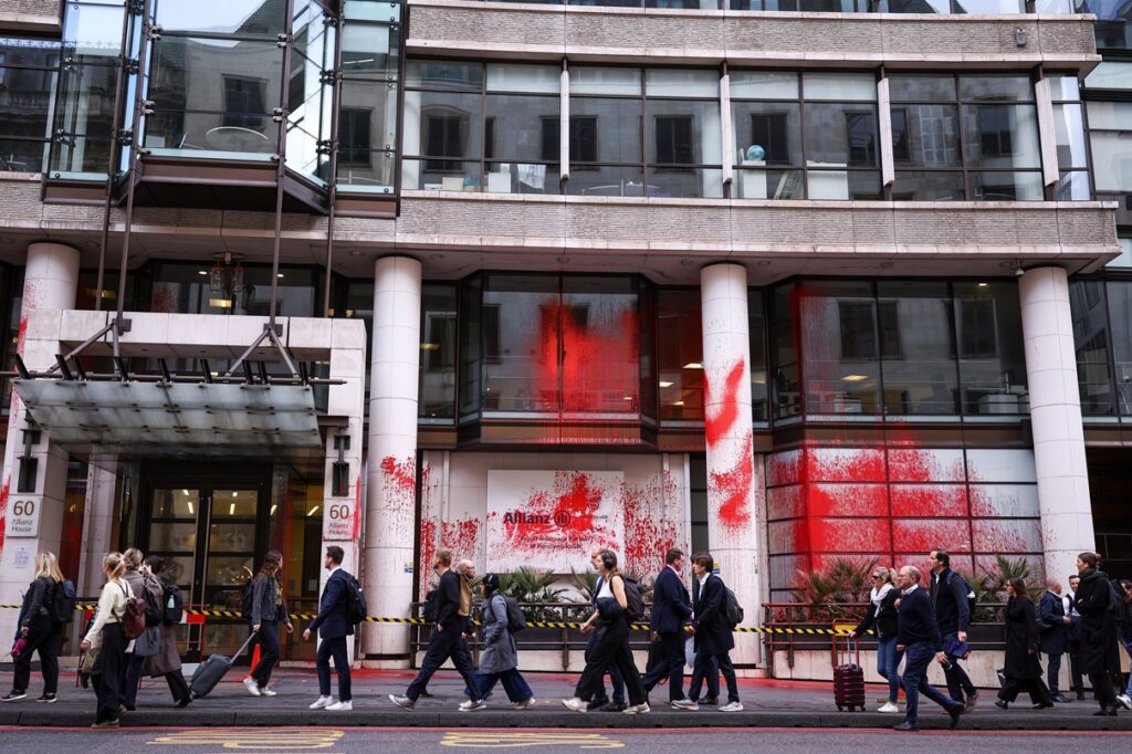 وأعلنت جماعة «العمل الفلسطيني» أن نشطائها هاجموا 10 مكاتب لشركة أليانز في المملكة المتحدة و«احتلوا» المقر الرئيسي للشركة في جيلدفورد جنوبي لندن الليلة الماضية.