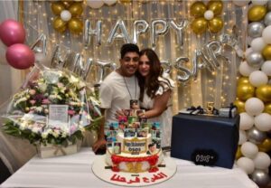 و عبر الفنان أوس أوس في حضور الجميع عن سعادته قائلا : “أحلي مفاجأة في حياتي ربنا يخليكي ليا يا قلبي ، و شكرا الأستاذ معتز التوني ، شكرًا ليكم كلكم واحد واحد ، بجد فرحتوني من قلبي والله ، و كل عيد جواز و إحنا دايما مع بعض بإذن الله”.