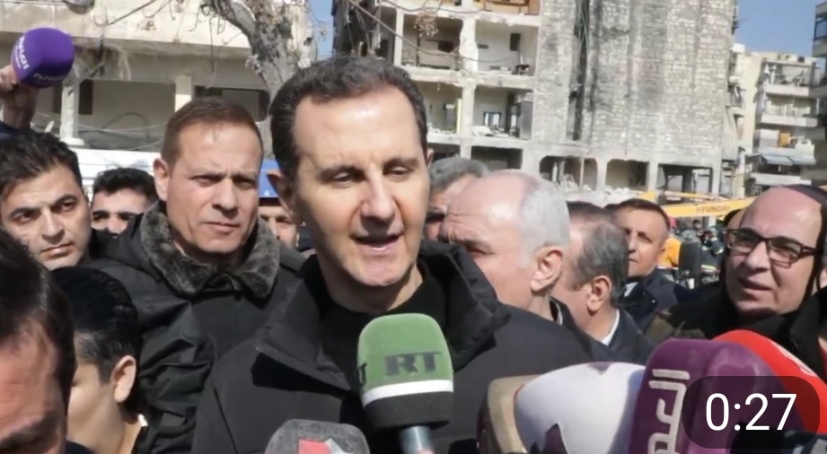 وزار الأسد اليوم موقعا تعمل فيه فرق الإنقاذ على رفع الأنقاض والدمار لانتشال المصابين وضحايا الزلزال بحي المشارقة بمدينة حلب.