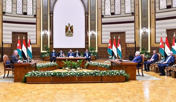 وتبحث القمةٌ المصرية الأردنية الفلسطينية جهود السلام وتنسيق المواقف لدعم القضية الفلسطينية.