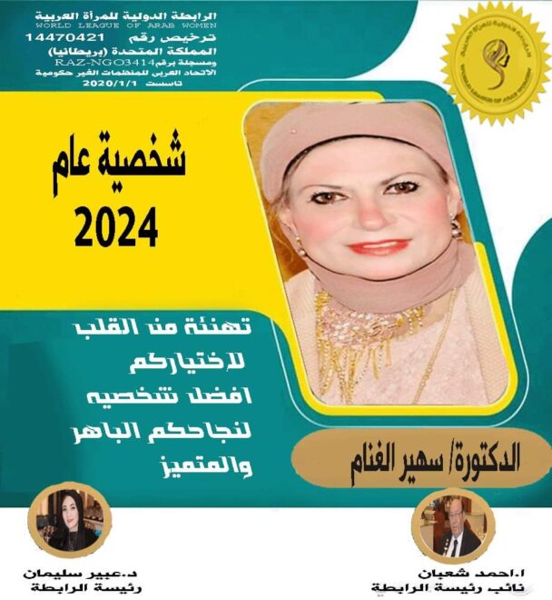 وذلك وقع إختيار مؤسسة الرابطة سعادة الدكتورة عبير عيد سليمان والنائب الأول للرابطة سعادة المستشار أحمد شعبان وجميع أعضاء الرابطة ترشيح دكتورة سهير الغنام وفوزها بهذا اللقب كشخصية العام 2024