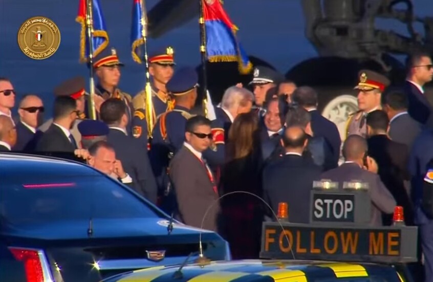 ووصل ترامب إلى مدينة شرم الشيخ للمشاركة في أعمال قمة شرم الشيخ للسلام، بعد زيارة إلى إسرائيل استمرت عدة ساعات، واستقبلت المقاتلات المصرية طائرة الرئيس الأمريكي منذ دخلوها للأجواء المصرية حتى لحظة هبوطها بمطار شرم الشيخ الدولي، وذلك ترحيبا بزيارة ترامب وتقديرا لدوره في وقف حرب غزة.