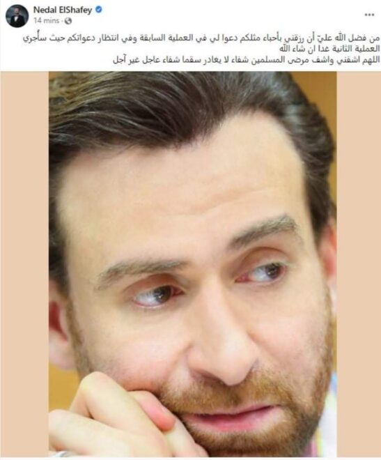 و كتب نضال الشافعي قائلاً : من فضل الله عليّ أن رزقني بأحباء مثلكم ، دعوا لي في العملية السابقة و في انتظار دعواتكم ، حيث سأُجري العملية الثانية غدًا إن شاء الله ، اللهم اشفني و اشف مرضى المسلمين شفاء لا يغادر سقما شفاء عاجل غير آجل”.