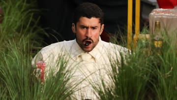 وظهر باني بإطلالة بيضاء من الرأس إلى أخمص القدمين، مع قميص رسمي، وربطة عنق تحت قميص كرة قدم مخصص مصنوع من القماش الصناعي، ظهر عليه اسم عائلته “Ocasio” ورقم 64، مع سروال أبيض من قماش الكتان، وحذاء أبيض كريمي من العلامة الأمريكية “أديداس”.