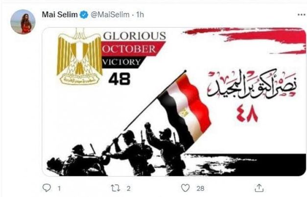 و غردت الفنانة رانيا يوسف عبر حسابها على تويتر قائلة : ” أكتوبر يعني النصر كل سنة و مصر و شعبها دائماً بخير”.
