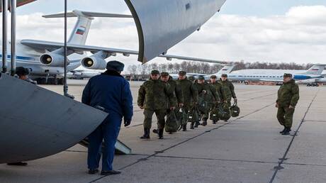 عسكريون روس أثناء صعودهم على متن طائرة النقل العسكرية “إيل 76”.