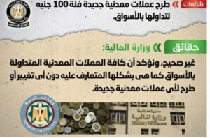وأكدت الوزارة أنه لا صحة لطرح عملات معدنية جديدة فئة 100 جنيه لتداولها بالأسواق، وأن كافة العملات المعدنية المتداولة بالأسواق كما هي بشكلها المتعارف عليه دون أي تغيير أو طرح لأي عملات معدنية جديدة.