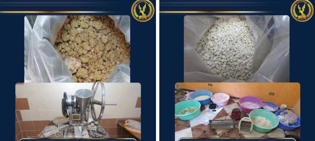 و عقب تقنين الإجراءات تم استهدافهما و تمكن رجال الأمن من ضبط أحدهما حال تواجده بالمنزل و بحوزته (170 ألف قرص لعقار الكبتاجون المخدر – 125 ألف قرص لعقار التامول المخدر – أدوات خاصة بالتصنيع و التغليف – مواد خام خاصة بالتصنيع وزنت “290 كيلو جرام” – مبالغ مالية – هاتف محمول).