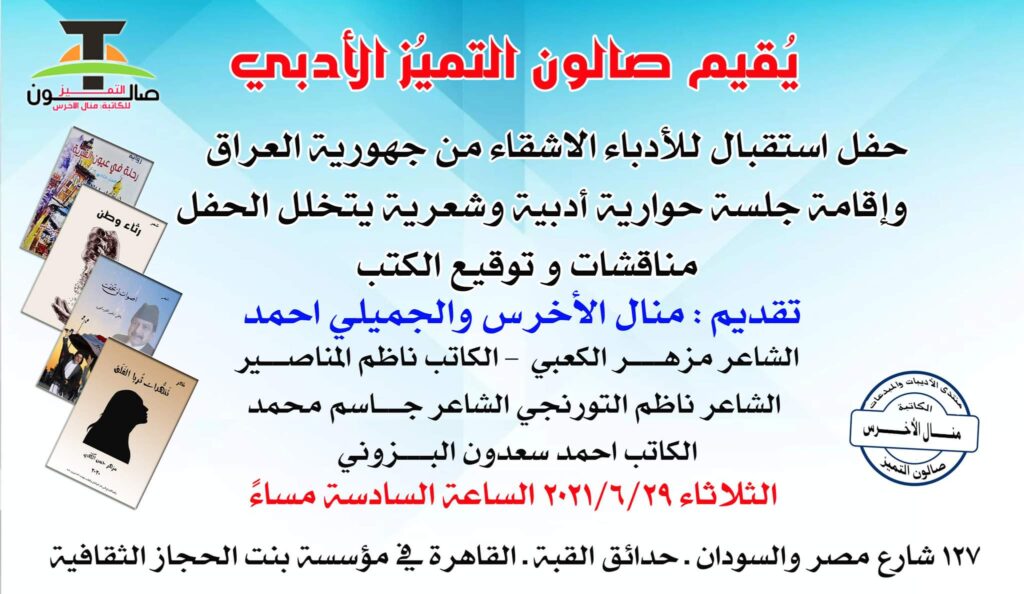 يتشرف صالون التميز للكاتبة والأديبة منال الأخرس بدعوة سيادتكم لحضور حفل استقبال الأدباء الأشقاء من جمهورية العراق وإقامة جلسة أدبية وشعرية يتخلل الحفل مناقشة وتوقيع الكتب للسادة الأدباء: