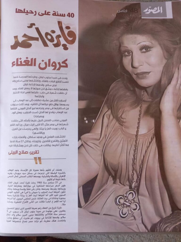 في ٢١ سبتمبر سنة ١٩٨٣ رحلت فايزة احمد عن ٥٢ سنة اي مر عليها ٤٠ سنة على وفاتها وهذا مقالي عنها في المصور وفاءا ومحبة لهذا الصوت الذي امتعنا باغاني خالدة مثل ..رسالة من امرأة وخليكوا شاهدين وحبيبي يا متغرب وغيرها ..حتى عدها البعض خليفة ام كلثوم في الغناء ..