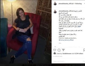 وقال في منشور عبر صفحته الشخصية بموقع “إنستجرام”: “الأخت والزميلة العزيزة منى فاروق، كلنا أخطاء ولكنه ستر الله، ولعل ما حدث لك علامة حب من الله، لأن الله إن لم يكن يحبك لما رفع ستره عن خطئك لكي تعودي إلى رحابه”.