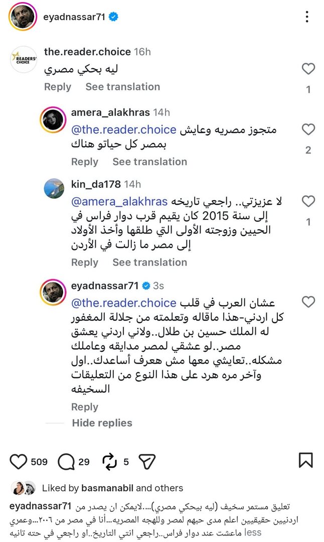 وجاء رد إياد نصار حاسماً، حيث كتب: “عشان العرب في قلب كل أردني.. هذا ما قاله وتعلمته من جلالة المغفور له الملك حسين بن طلال.. ولأني أردني بعشق مصر.. لو عشقي لمصر مضايقك وعاملك مشكلة.. تعايشي معها مش هعرف أساعدك”.