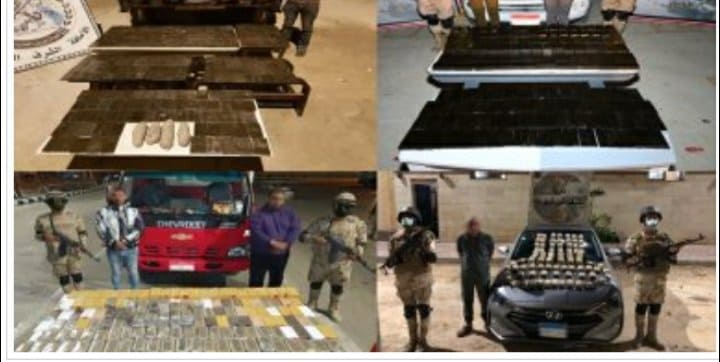 كما تمكنت قوات حرس الحدود أثناء عمليات التفتيش و التأمين الدورية للسيارات و المركبات بالأنفاق و المعابر الحدودية ، من ضبط 1050 كجم لجوهر الحشيش المخدر و 1020 كجم لنبات البانجو المخدر ، و 93 ألف قرص مخدر أنواع مختلفة ، و 10 كجم لمادة الأفيون المخدر و 150 كجم لنبات الهيدرو المخدر.
