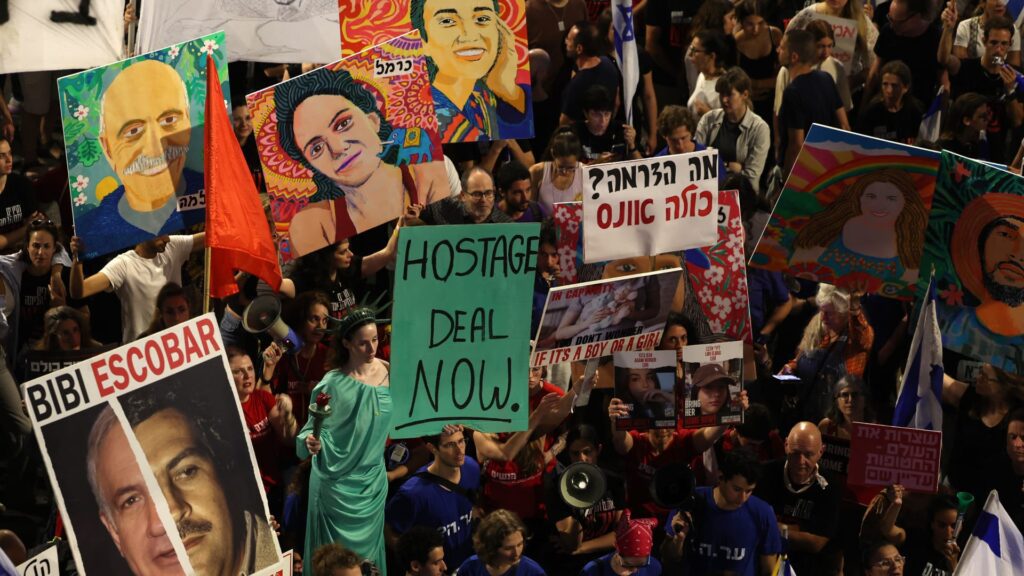 وفي تل أبيب، تمتلئ ساحة الديمقراطية بالمواطنين الذين يطالبون نتنياهو بقبول صفقة إطلاق سراح الرهائن.