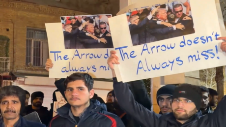 وحمل المتظاهرون صورا للرئيس الأمريكي دونالد ترامب بعد نجاته من محاولة اغتيال كتب عليها: “السهم لا يخطئ دائما”، كما هتفوا “الموت لأمريكا” و”الموت لإسرائيل” وأضرموا النار في العلمين الأمريكي والإسرائيلي.
