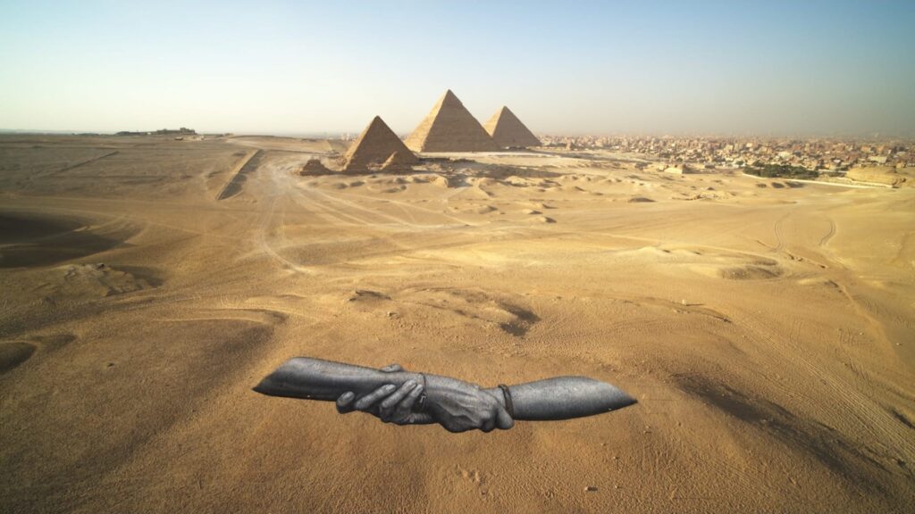 للوهلة الأولى، ستخال ربّما أنّ هذا المشهد ليدين عملاقتين ممسكتين ببعضهما على رمال سفح أهرامات الجيزة في مصر، مجرّد صورة أنتجها الذكاء الاصطناعي.. لكن في الحقيقة، هو عمل فني واقعي من توقيع فنان سويسري فرنسي يُدعى سايبي.