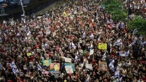 عشرات آلاف الإسرائيليين يتظاهرون في تل أبيب للمطالبة برحيل حكومة نتنياهو وإجراء صفقة تبادل أسرى مع “حماس”
